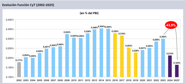 En dos años el financiamiento público en ciencia y tecnología se redujo un 43,8%, pasando del 0,300% en 2023 hasta alcanzar un mínimo en relación con el PBI del 0,164% en 2025. De esta manera se encuentra por debajo incluso del anterior mínimo en el año 2002, reveló el informe de situación “Dos años de políticas de ciencia y tecnología (2023-2025)” elaborado por el Grupo EPC del Centro Iberoamericano de Investigación en Ciencia, Tecnología e Innovación (Ciicti).